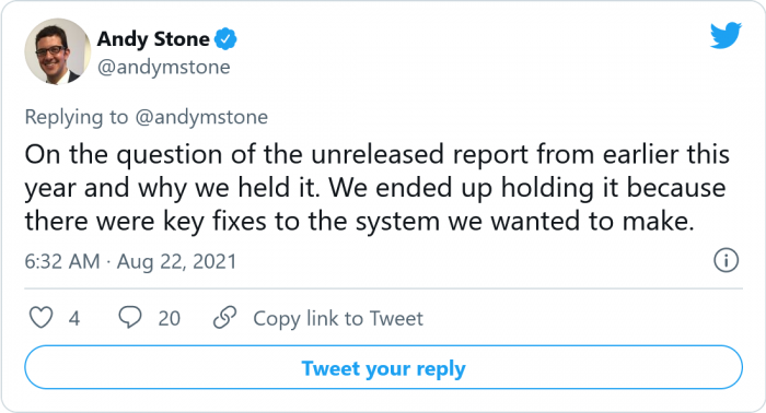 鉴于目前的事件,Facebook政策公关经理安迪·斯通在推特上表示,Facebook因公开报告而面临的批评“并不不公平”。她说: