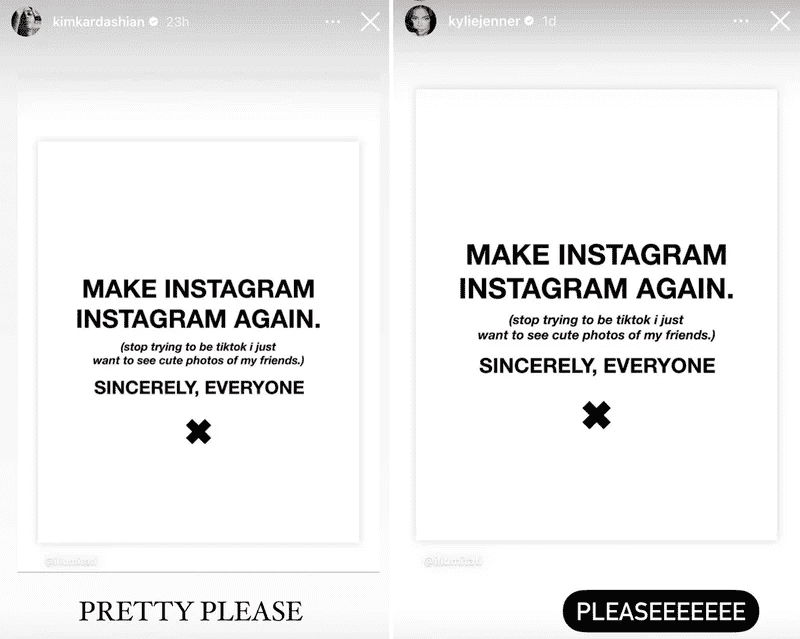 塞尔曼说:“该公司别无选择,只能模仿他所谓的Tiktok的大型才华展览。Tiktok来了,就像谁在乎您跟随谁!”人们注意到,包括凯莉·詹纳(Kylie Jenner)和金·卡戴珊(Kim Kardashian)在内的Instagram最受欢迎的名人人物最近在Instagram和Facebook的改革中上传了他们的故事,并表示他们希望看到朋友的照片,而不是像Tiktok这样的视频。他们写道:“再次制作Instagram Instagram。停止尝试成为Tiktok。“