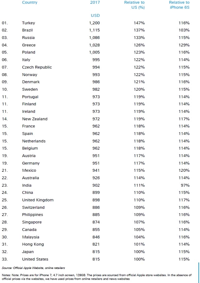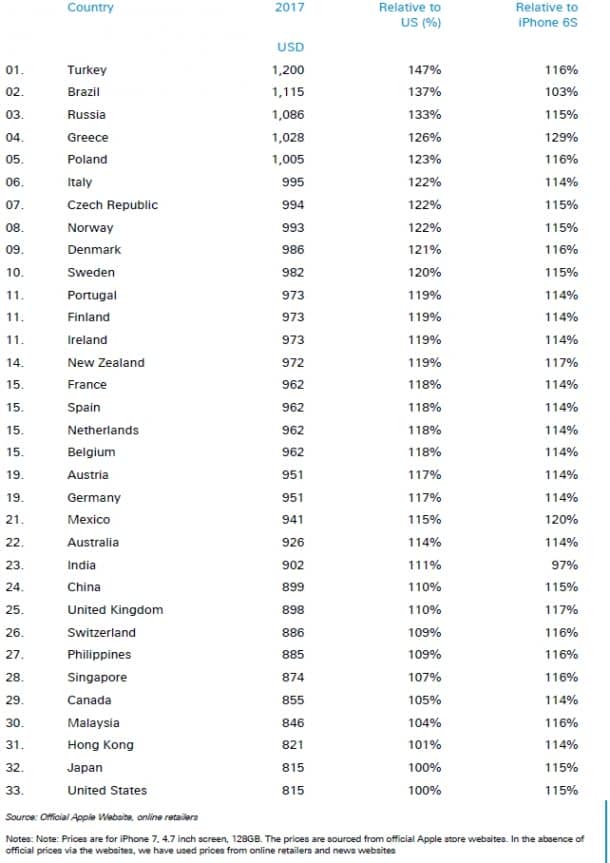 根据《福布斯》的数据,苹果是世界上最赚钱的公司,其净资产为2560亿美元,年利润接近500亿美元,而这主要归功于iPhone。如果你想买一部iPhone,你必须准备好掏空你的口袋,但每个国家的价格都有很大差异。德意志银行发布了一份名为“绘制世界价格”的报告,列出了iPhone 7在全球33个不同国家的价格。如果你在旅行的时候带上它,你可能会省下一大笔钱。