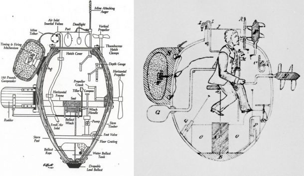 首次成功使用军事潜艇在战斗发生在1775年美国独立战争期间。潜艇是由美国发明家设计的大卫·布什内尔和被任命为龟。这是一个蛋形的设备,只能容纳一个人,是手动的。这是第一个水下潜艇是能够独立操作和运动。乌龟潜入水中,允许一些水倒进污水舱底部的容器。它通过手动泵提升推水。手摇螺旋桨提供了垂直和水平运动速度为4.8公里/小时。包含的船到足以进行30分钟的操作。