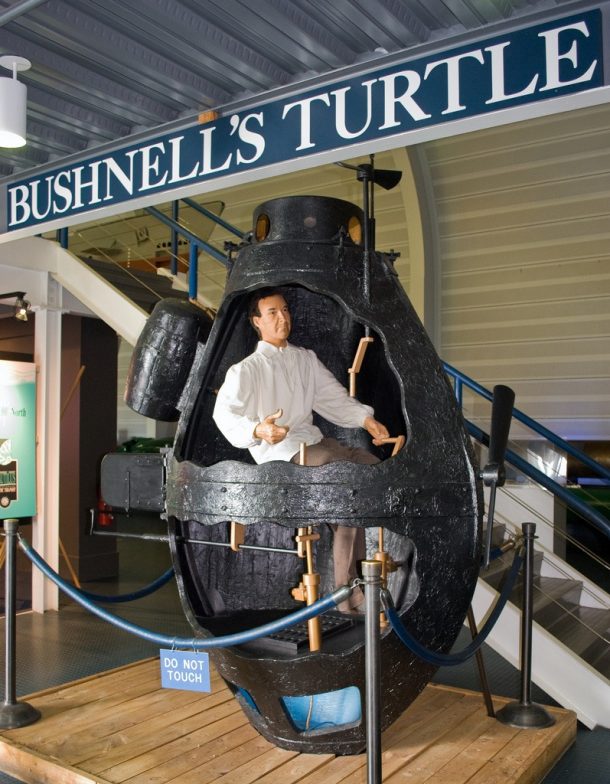 在美国独立战争期间,乌龟”是由以斯拉·李。他试图袭击英国军舰HMS鹰在他可以攻击之前,他被发现,被迫放弃潜艇。然而,这种攻击的唯一记录,美国人,英国历史上没有这样的事件记录,使整个故事表示怀疑。乌龟的副本模型现在一些博物馆展出在美国以及英国皇家海军潜艇博物馆在通话软管,英格兰。