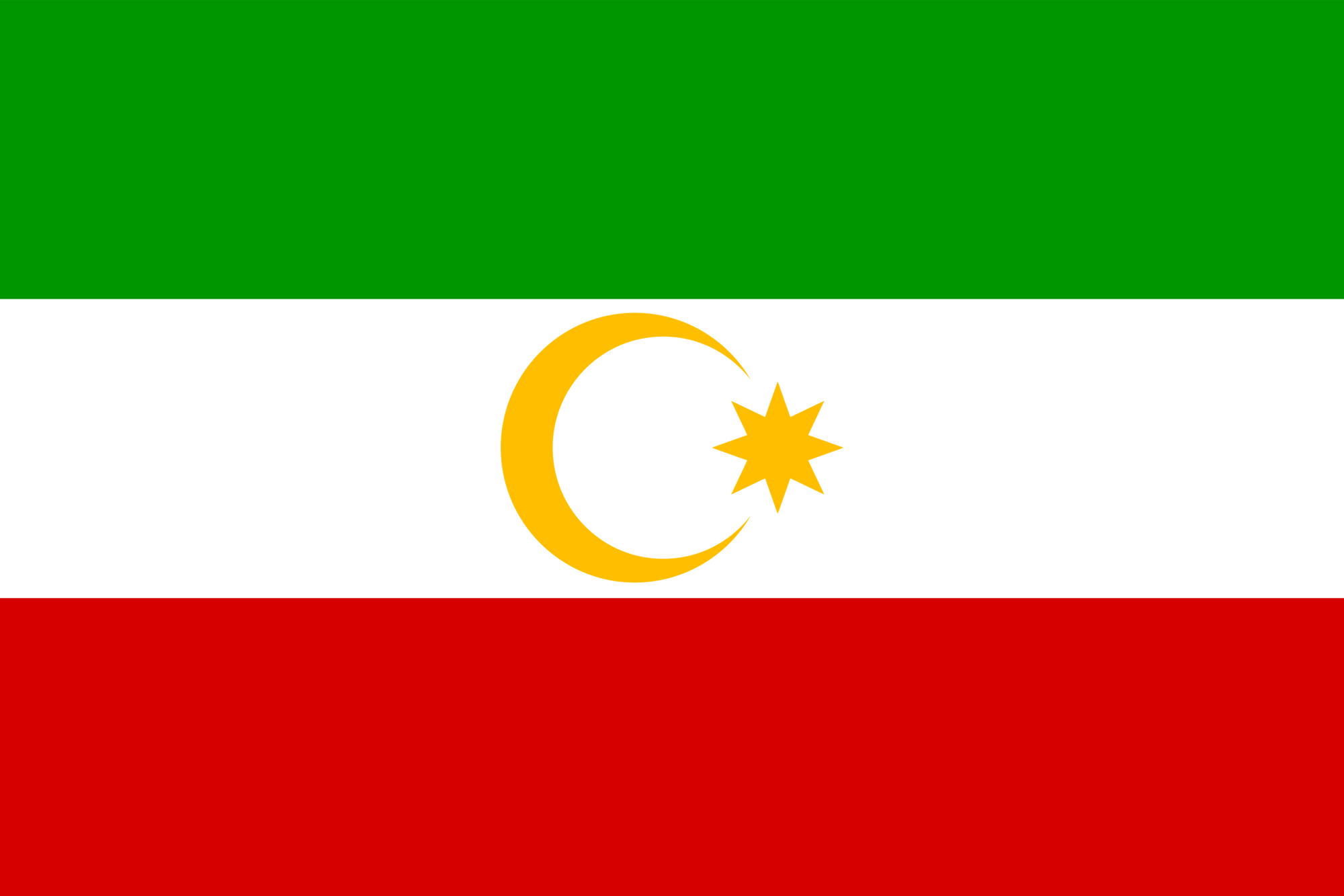 三个等效的水平颜色组蓝色(顶部),中间红色,底部为绿色;白色的八点恒星和新月形基于红色带。蓝色的最高条记得阿塞拜疆的土耳其文化,红色似乎是现代化和改进的,而格林则代表伊斯兰教。新月形卫星是伊斯兰的偶像,而八角恒星则象征着全球八个突厥人。