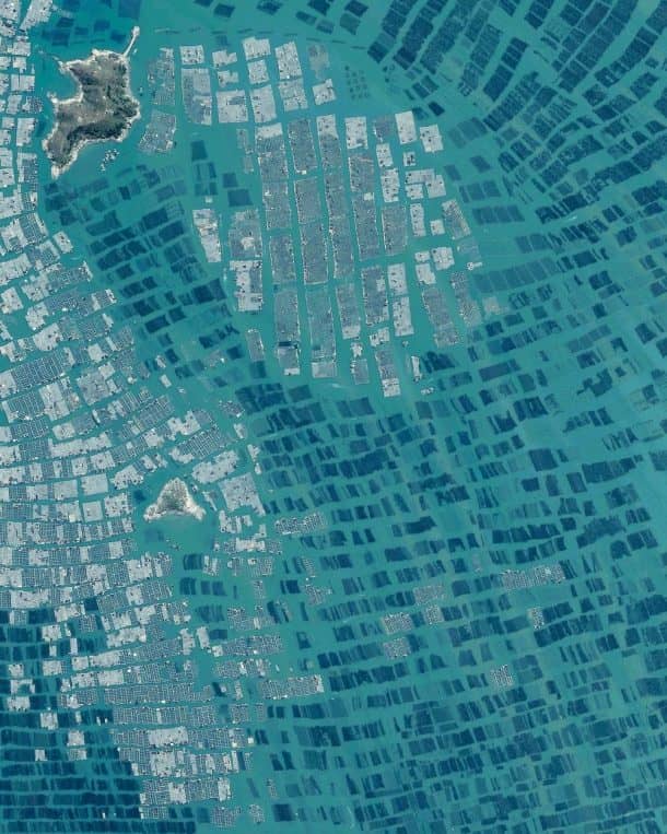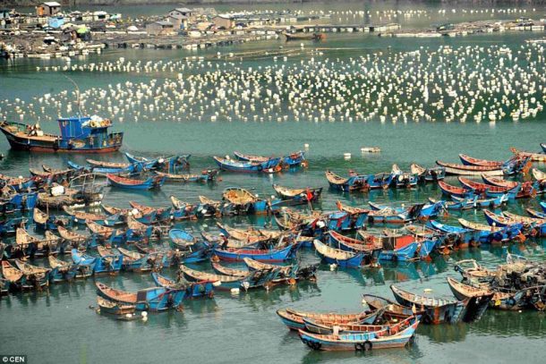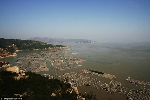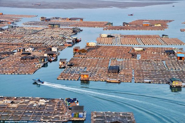 中国250亿英镑的养鱼产业在东方海,南中国海和黄海的广阔水域建立,在过去的3000年中一直是该国的主要经济来源。这些农场的木制平台和路径网络标志着这些农场。
