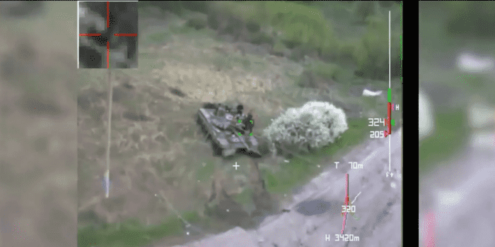 一张游荡弹药的视频,通常被称为Kamikaze或自杀无人机,中和俄罗斯坦克已出版Facebook由乌克兰军方的特种作战部队。
