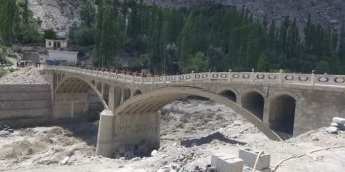 在喀喇昆仑公路混凝土桥梁在罕萨Hassanabad区周六倒塌,造成交通堵塞,迫使乘客找到另一条路线。