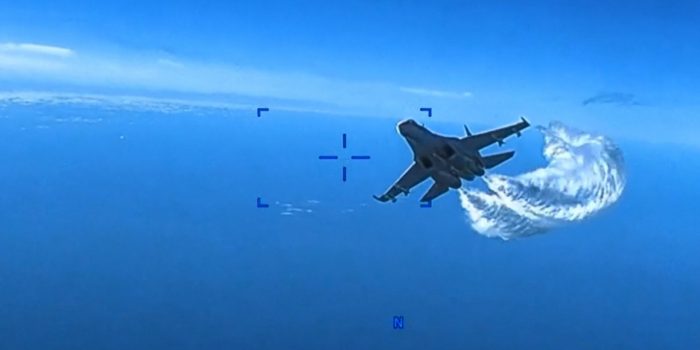画面显示,苏- 27侧卫做了两个特别的亲密通过“无人机战术,美国专家声称没有见过的。第二,飞机变得如此接近相机曾一度成为像素化的mq - 9收割者,表明碰撞发生。无人机持续严重破坏之后,它被迫减少了美国空军,落在黑海。
