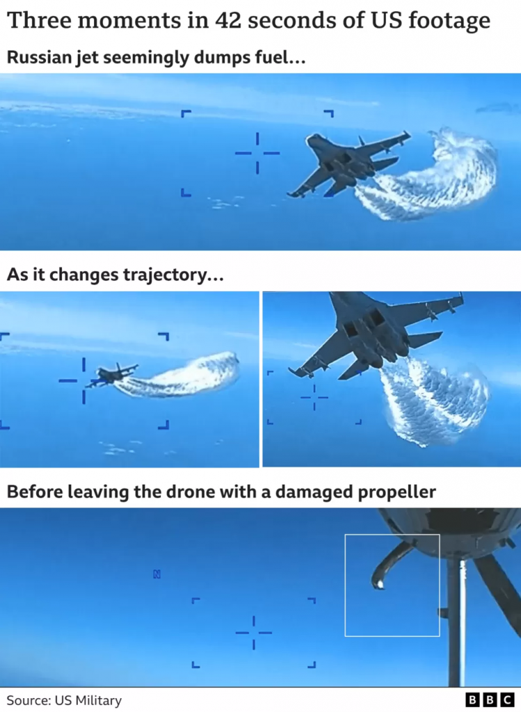 美国官员证实,有碰撞和倾销的燃料,如视频所描述。不过,他们还没有决定俄罗斯飞行员的意图或者是有意的。当画面停顿了一下,观众可以看到苏- 27是配备至少四个导弹。美国已经表示,“收割者”无人机是手无寸铁,最有可能进行监视和侦察与乌克兰的冲突有关。
