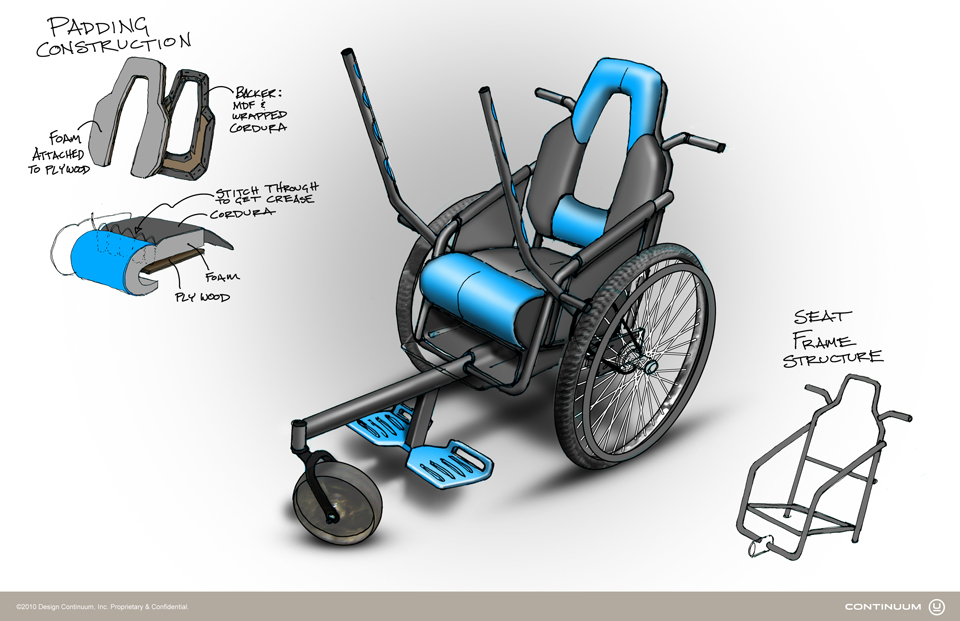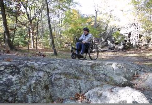 这款轮椅由4130的铬钢框架制成,首尾长度为48英寸,同时结合了26英寸的快速释放山地自行车车轮和1.75英寸的混合动力轮胎。8.75英寸的前轮是由坚固的橡胶制成的,使稳定性更好。这款轮椅可以容纳220磅重的人,配有软垫座椅和脚垫,可以根据用户的需要进行调整。