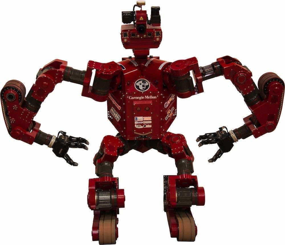 卡内基·梅隆大学(CMU)的团队在DARPA的挑战中熟悉。他们凭借自主皮卡车赢得了2007年城市挑战。该团队已经开发了一个400磅重的类人动物,由于其长长的长臂(完全打开时),它比人类更像猿,而不是人类。机器人在每个肢体上都有坦克胎面,以帮助其覆盖更长的距离,因此它不必担心平衡自己。站立时,黑猩猩的总高度为5'2“。黑猩猩还使用3-D映射而不是实时饲料摄像头为控制器提供反馈。