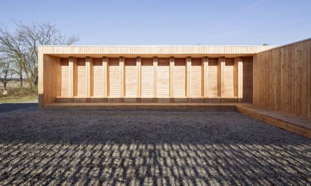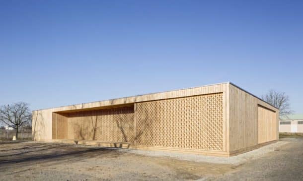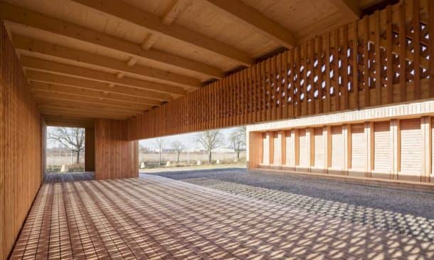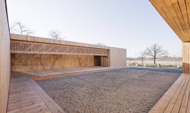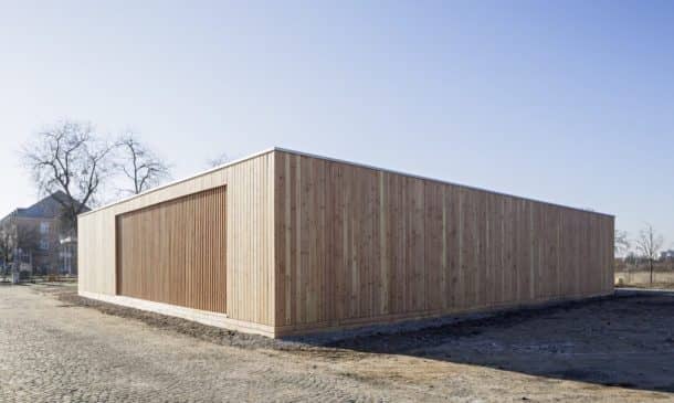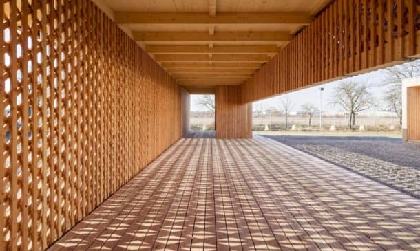 轻量级的社区中心构造完全未经处理的木材,较大的块预制的前军事设施后,组装。
