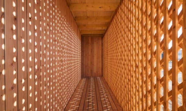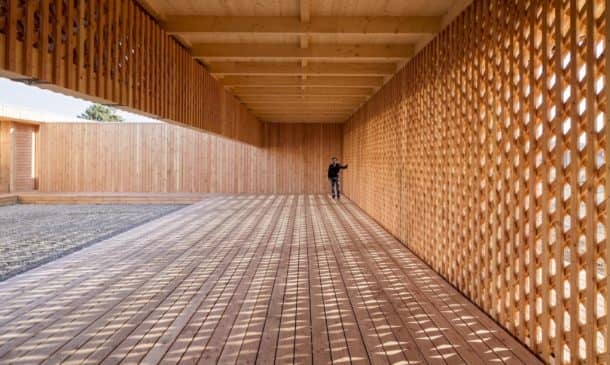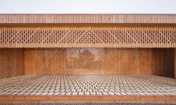 的主墙的结构是由道格拉斯冷杉,和墙承受对称网格允许支撑结构、自然通风和照明创建的光线和阴影。