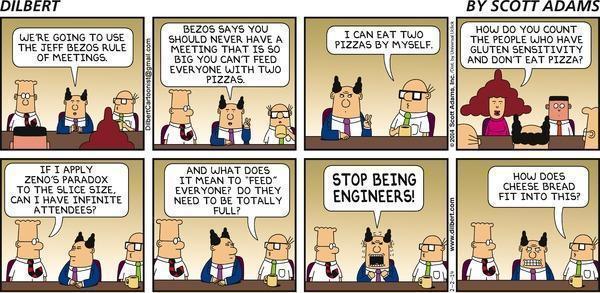 亚马逊的杰夫·贝佐斯(Jeff Bezos)有一个有趣的理论,他称之为“两披萨规则”。这表明您永远不要开会或一个团队,那里有两个全尺寸的披萨无法养活整个小组。这意味着您的小组最多不应超过8至10人;可以满足两个比萨饼的人数。