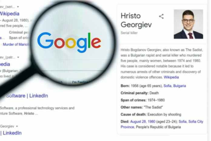 一个工程师在瑞士做相同的搜索自己和无害的行为惊呆了,看看出现在屏幕上。他的名字叫斯托吉奥吉夫也共享一个连环杀手。这种相似性的名字导致整个混乱。当他他的名字搜索,结果显示在谷歌工程师斯托的连环杀手的细节的照片。这一事件让他惊讶,他说他不知道如果这是滑稽或可怕的”。