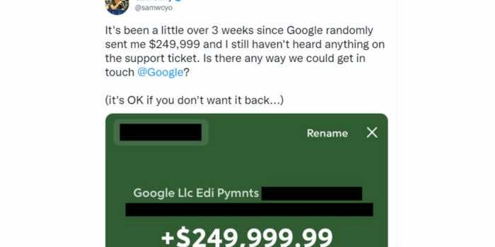 “自Google随机向我寄给我249,999美元以来已经有三个多星期了,我仍然没有在支持票中听到任何消息。”