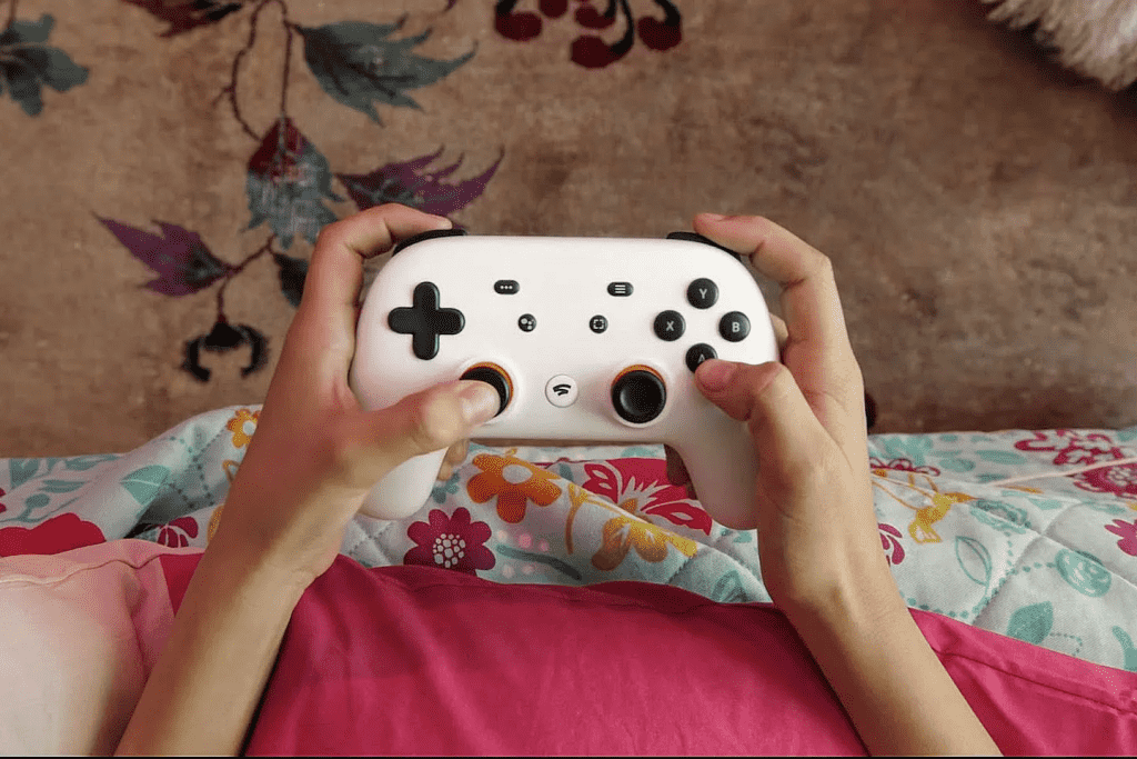 一个人拿着智能手机连接控制器。手机现在是从事游戏从视距,谷歌的云游戏服务。