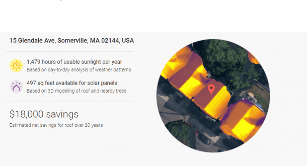 The tool calculates solar savings using attributes like roof size and shape, shaded roof areas, local weather, solar costs, local electricity prices, and estimated incentives. The graphic below shows a detailed estimate provided by Project Sunroof on a certain address.