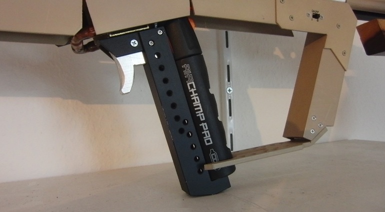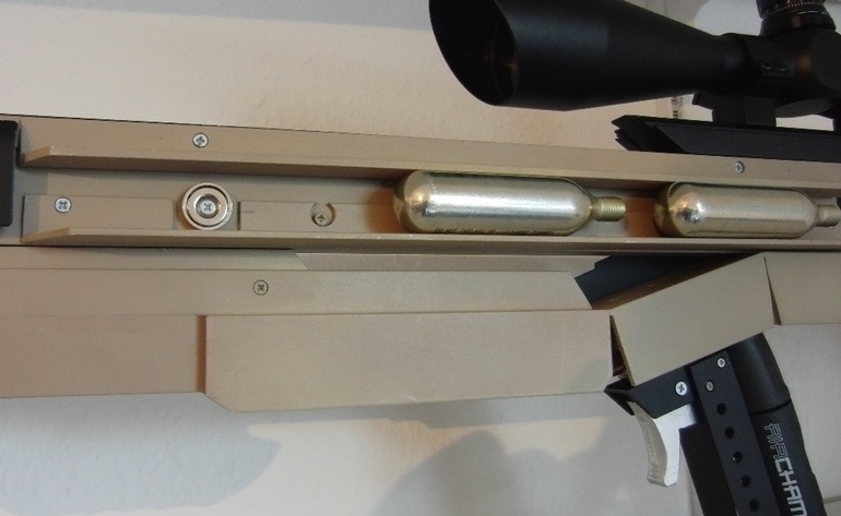 普里贝(Priebe)必须从基本的东西开始,他可以随着时间的流逝而逐渐改善。他得到了一支已经使用的呼吸动力枪,并选择将其设计围绕它。它射击了飞镖,所以他不得不选择类似于飞镖的东西,这意味着要推别针!引脚存储在基于泡沫聚苯乙烯的弹药夹中,必须手工装入枪中,然后在简单的螺栓动作杆的帮助下将其放置在适当的位置。爆炸的空气将推杆从枪管中射出,该枪管由压缩空气罐提供动力。每个罐子都可以帮助您发射五个大头钉和一个额外的储物桶,位于主桶下方,用于存放额外的罐子。