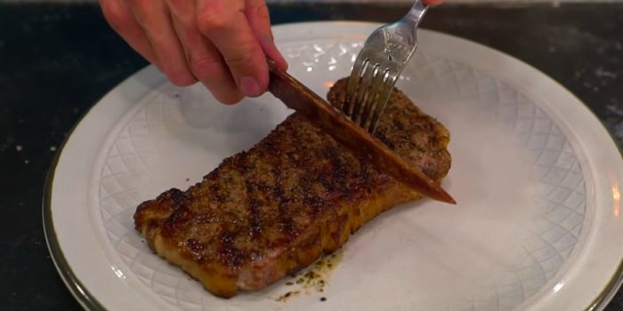 最终的结果看起来接近你的想象。它是用肉做的,你很可能会想到用刀咬一口,而不是牛排。