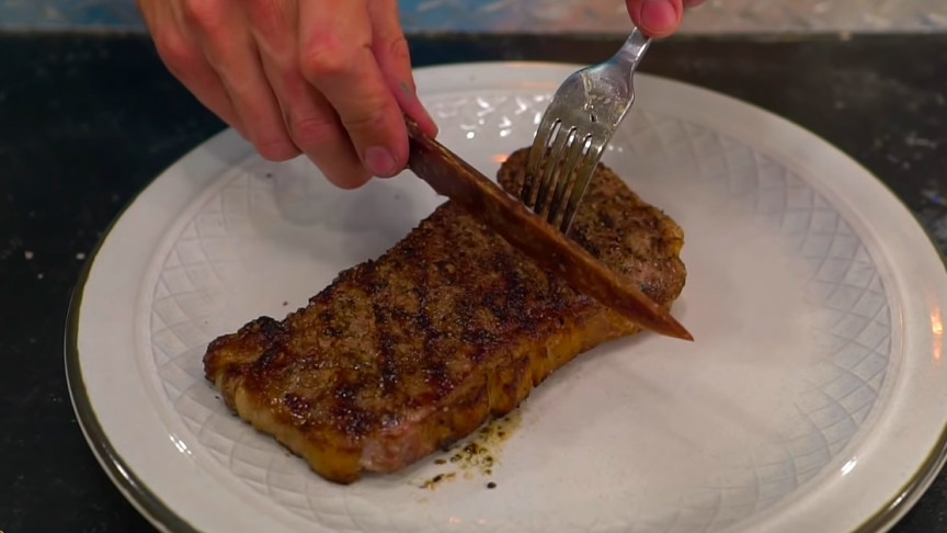 最终的结果看起来接近你的想象。它是用肉做的,你很可能会想到用刀咬一口,而不是牛排。