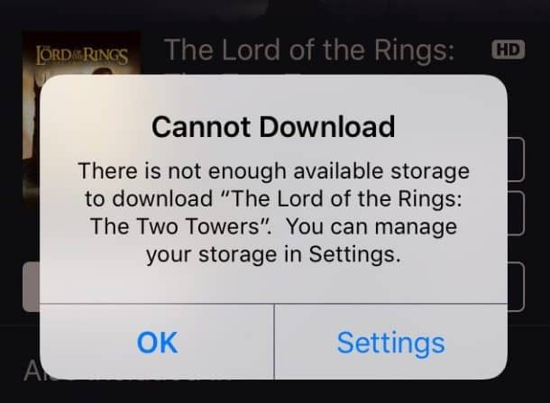 现在你有了几mb的空间,下一步就是打开你的iTunes应用程序,找到你能找到的最长的电影。时间越长越好。一旦你找到了,就按房租。不用担心,你不需要为此付费,因为你没有足够的存储空间来下载这样的电影。将弹出一个通知,通知您低存储。在这一点上,你需要从弹出的通知框转到设置,看看魔术发生了。