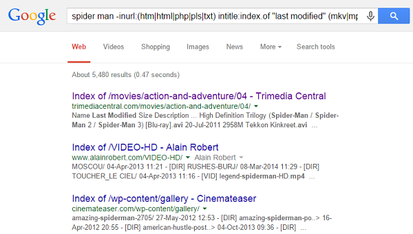 例子:蜘蛛侠inurl: php (htm html | | |请| txt)取名:索引。的“最后修改”(mkv | mp4 | avi)。