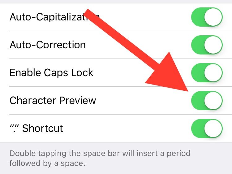 转到设置>一般>键盘,然后关闭'字符预览'。