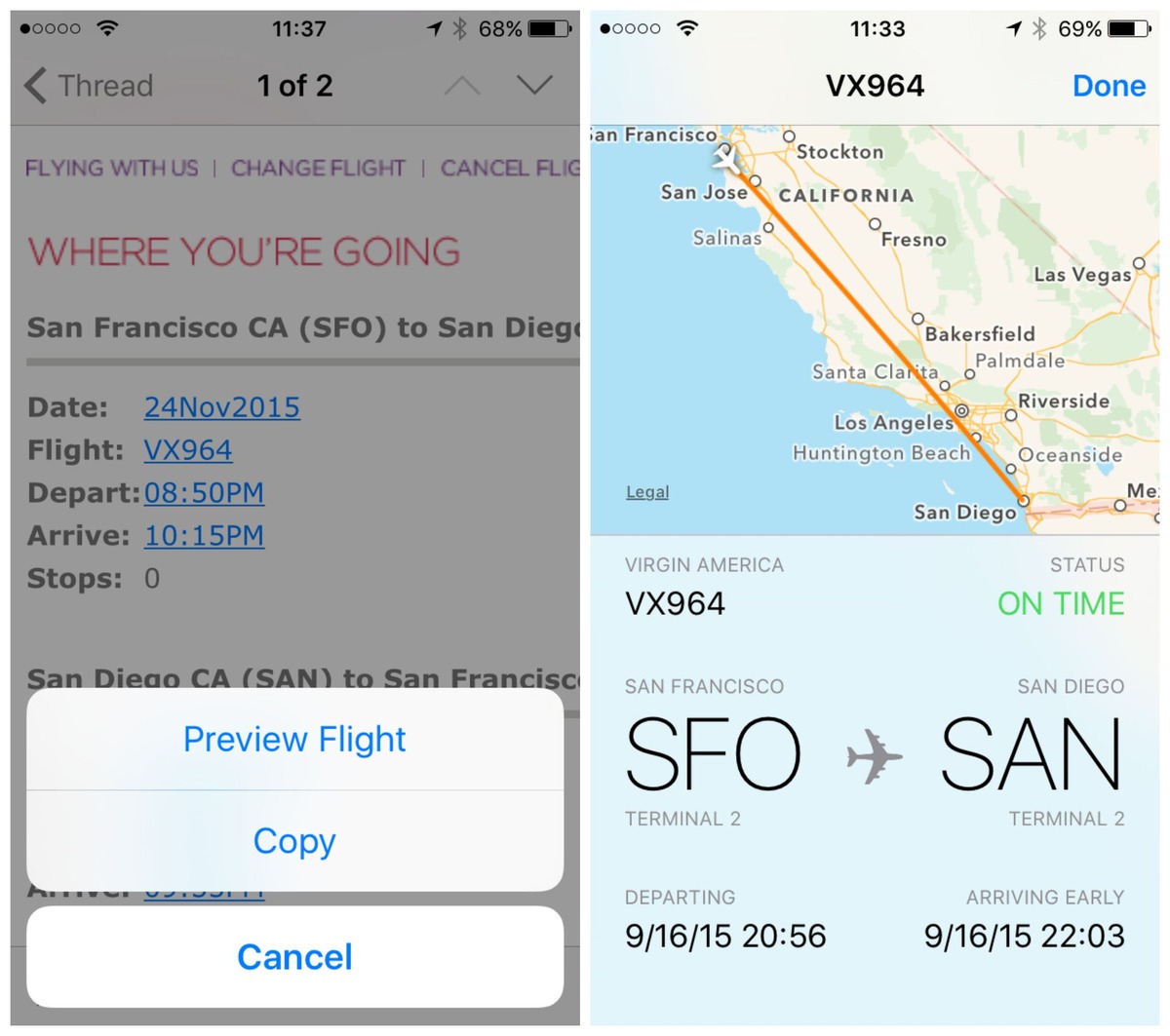 如果你在“邮件”、“消息”或“笔记”应用程序中有航班号,点击它可以查看该航班的信息,包括飞行轨迹地图。