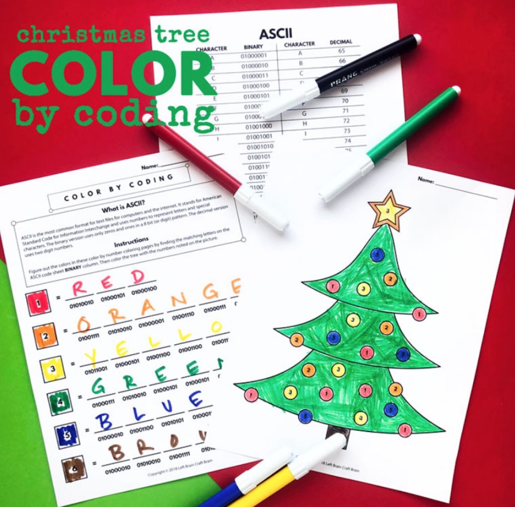 在这种情况下,孩子们会用一套不寻常的规则为圣诞树上色。可打印的着色页包含ASCII二进制代码和十进制代码作为颜色的关键。当孩子们着色时,他们正在不断地了解计算机背后的基本思想。