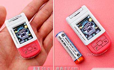 这款摄像机手机的长度为2.64英寸,微型重量为55克。它带有1.3百万像素摄像头以及触摸屏,手写识别,MP3和GPRS。你可以得到一个这里
