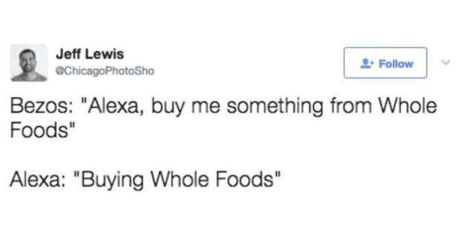 杰夫·贝佐斯(Jeff Bezos):“ Alexa,从Whole Foods买了一些东西。”
