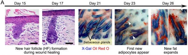 “本质上,我们可以操纵伤口愈合,这样它会导致皮肤再生而不是疤痕。秘密就是毛囊再生。之后,脂肪会从这些毛囊再生的信号。”