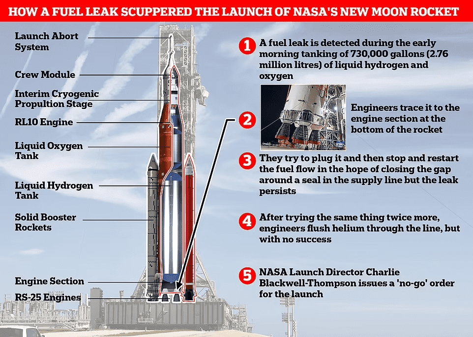 周六早些时候,由于发射小组开始在恶劣的天气之后,发射团队开始将近100万加仑的燃料加入太空发射系统火箭。但是,飞行后的几分钟,氢燃料开始从火箭底部的发动机部分泄漏,违反了安全法规。