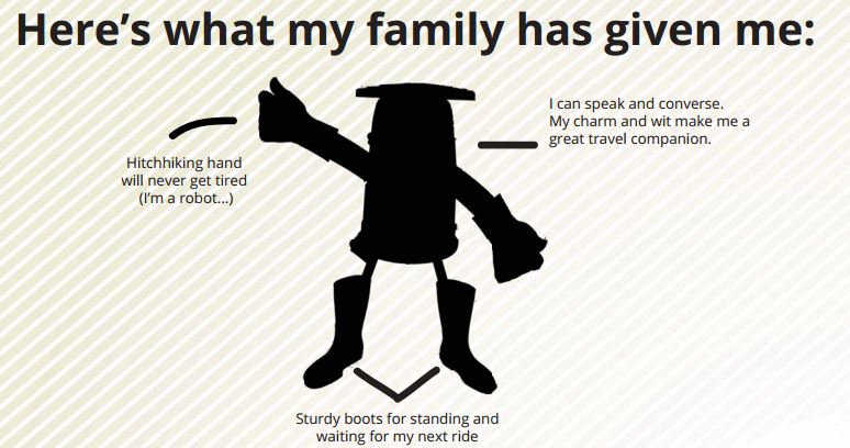 根据Zellar博士的说法,在描述Hitchbot应该说的样子时;‘Somebody has cobbled together odds and ends to make the robot, such as pool noodles, bucket, cake saver, garden gloves, Wellies, and so forth.’ We, however, do believe that ASIMO by Honda is a far better competitor if you want to see who can hitch a ride.