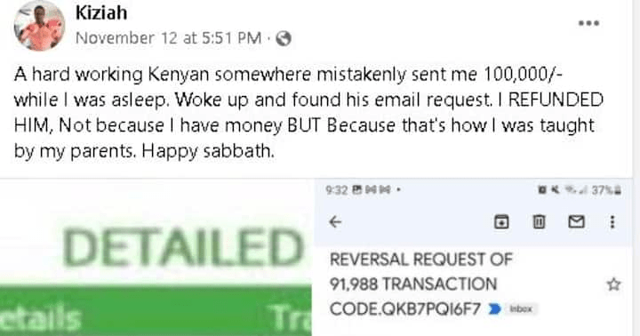 一个肯尼亚人在他的Mpesa账户上错误地收到了91,988肯尼亚先令。Tuko报道称,这名名叫基齐亚·菲尔伯特的人将资金退还给了发件人,因为他看重诚实。