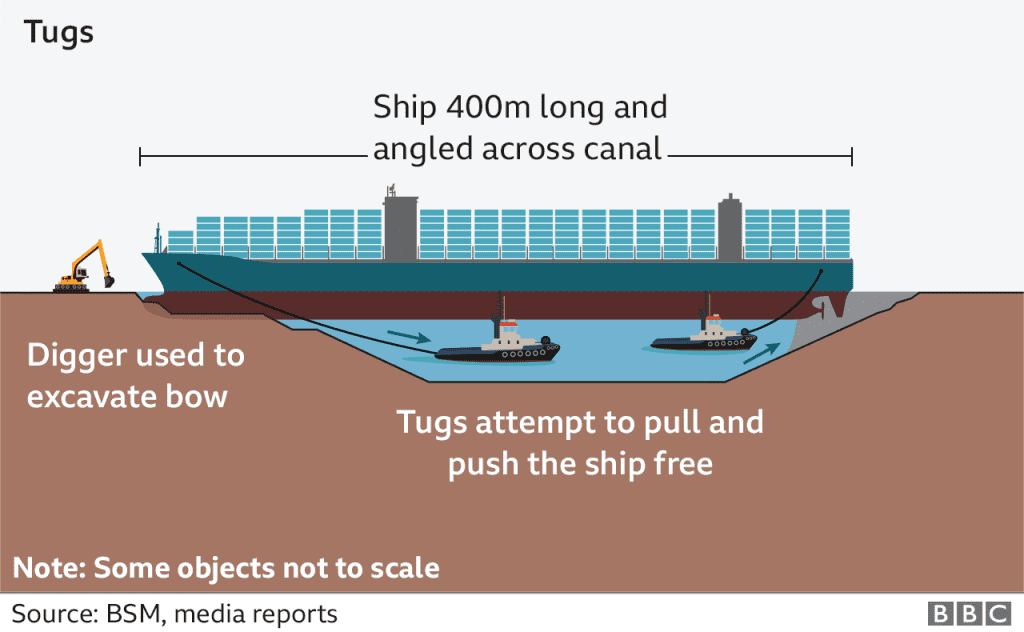 这是目前最可能的解决方案,而且已经在“Ever Given”被卡住的地方周围进行挖掘工作。然而,岩石土壤一直阻碍着工作,因为设备必须小心放置,否则就无法工作。为了移动这艘船,必须先移动超过50万立方英尺的沙子。荷兰打捞公司Smit和日本打捞公司Nippon打捞正在领导打捞Ever Given号的工作。不过,这一过程将需要几天甚至几周的时间。