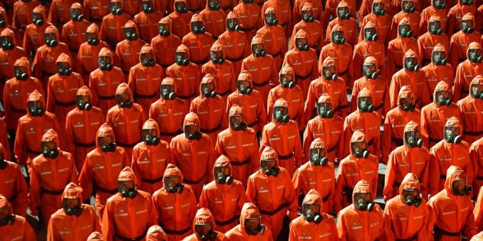 在游行中,一部分士兵和工人穿着鲜红色的防护服和防毒面具游行,这可能是为了帮助防止新冠病毒的传播而成立的特别工作组。