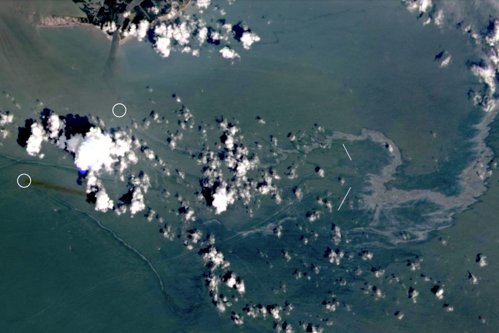 “这是一次重大的泄漏,需要进一步调查,”佛罗里达州海湾微风(Gulf Breeze)水域测绘公司(Water Mapping)的科学家奥斯卡·加西亚-皮内达(Oscar Garcia-Pineda)说。他领导了利用卫星和航空图像探测石油泄漏的研究。他说:“我看到了厚厚的重油的迹象,这是主要的黑色特征,周围是彩虹般的光泽。”