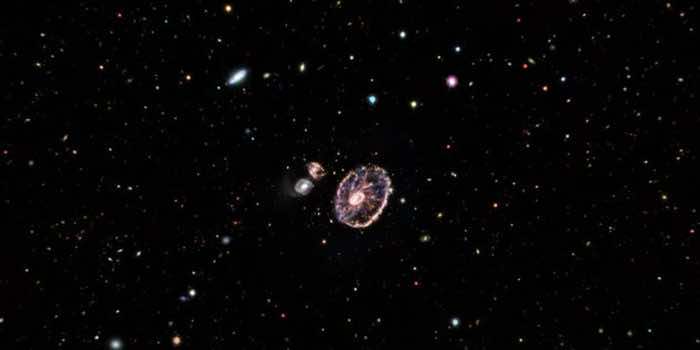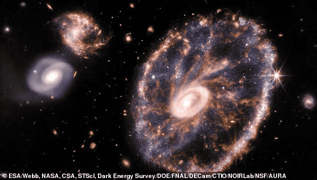 100亿美元(£74亿)天文台强大的红外凝视了一个罕见的景象的车轮和两个小的同伴星系的背景下许多其他星系。