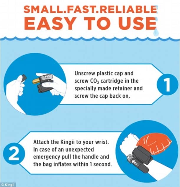 设备由一个气球充气尼龙存储在一个小袋筒和二氧化碳。腕带是绑在佩戴者的手腕,和该公司声称这是可靠的传统的救生衣,连同更舒适和体积更小。