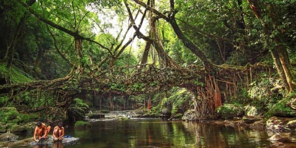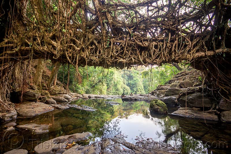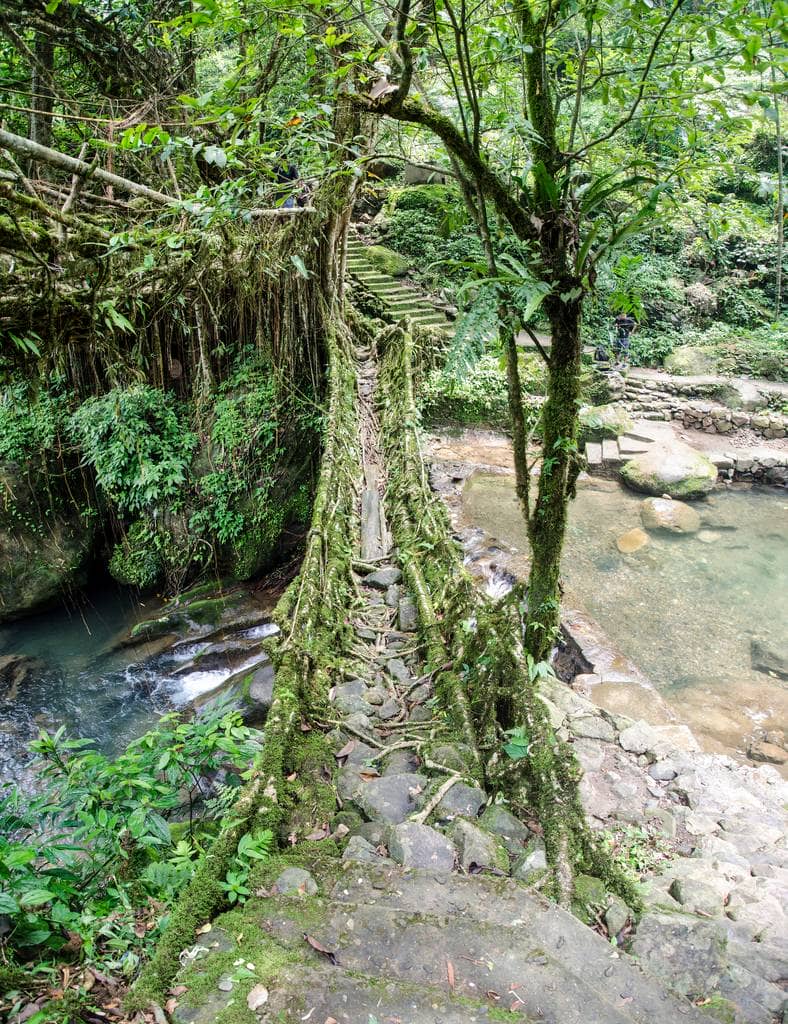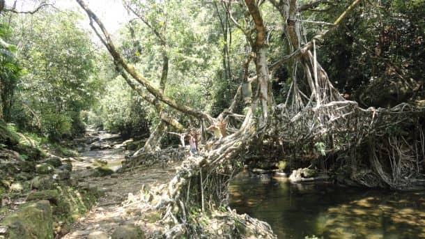 印度榕树(也称为橡胶树)在河岸上大量生长,将根部延伸到水流,以消除其口渴,而Khasi人则利用巧妙的工程技术利用这种机会,将它们构建成强大的桥梁,甚至是大自然的母亲不敢摧毁。将树的根驯服到桥上需要15到20年,但在积极的一面,它们几乎不需要维护。