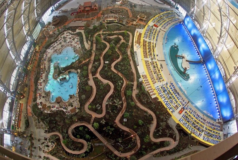 如果指定的飞艇从未建造,飞艇机库该怎么办?答案很简单;你可以把它变成一个室内热带岛屿度假村。位于柏林以南约60公里处,我们有世界上最大的圆顶,是一个人工热带度假村。该结构本身长360米,宽210米,高107米,使用了14000吨钢材来保持直立。为了给我们的读者一点观点;它可以容纳8个足球场,自由女神像可以很容易地放在里面。这座建筑的容积为550万立方米。大厅里没有支柱。这个建筑是在2000年为CL160设计和建造的,但从来没有完成,最终该公司在2002年破产,两年后出现了热带岛度假村。