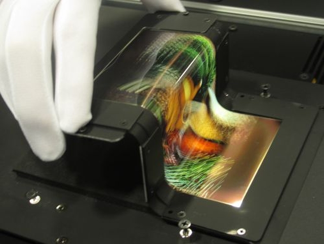 有机发光二极管(OLED)中使用的可折叠显示层的光。触摸传感器都包含在这些显示意义的设备是一个触摸屏角度和曲率。这是显示在显示创新展览在横滨。风景的照片,猫和孔雀显示被弯曲,弯曲的显示,在演示。