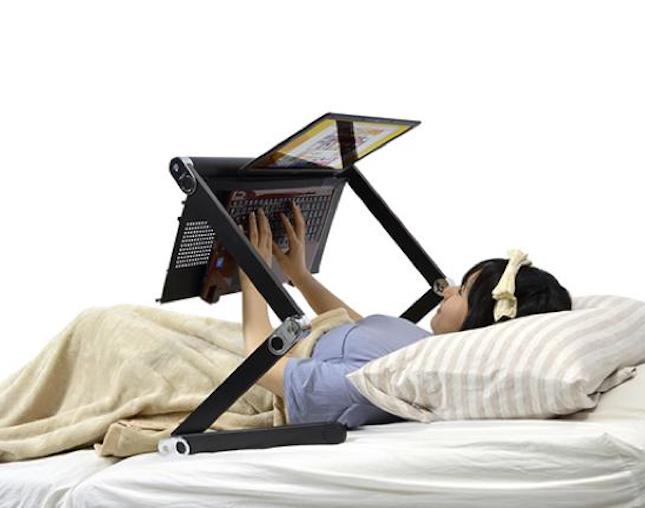 懒惰的桌子是由一家日本公司专门设计的,所有这些笔记本电脑用户希望能够在躺在床上或沙发上使用计算机。Sanko的懒惰桌子向您保证了机器的全部安全性,并配备了皮带和橡胶钩,以将计算机固定在适当的位置并防止掉落。