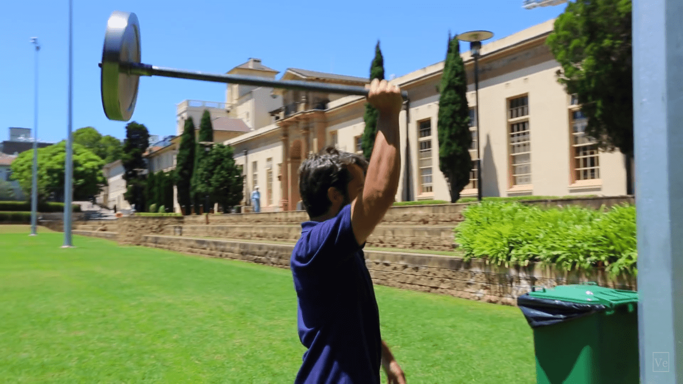 在举起重物之前,这位youtube用户演示了他如何勉强把杆子举到离重物很近的地方。巨大的力矩使他无法把它举得很远。为了保持重量的平衡,他必须在相反的方向上施加一个力来保持重量直立,从而在举起时给人一种更重的感觉。