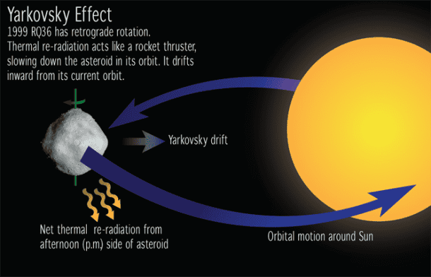 另一个相关的现象是雅科夫斯基效应当太阳加热一侧的小行星。当小行星旋转向冷空间,加热小行星释放热能的一部分。因此,它导致一个力,推动小行星。