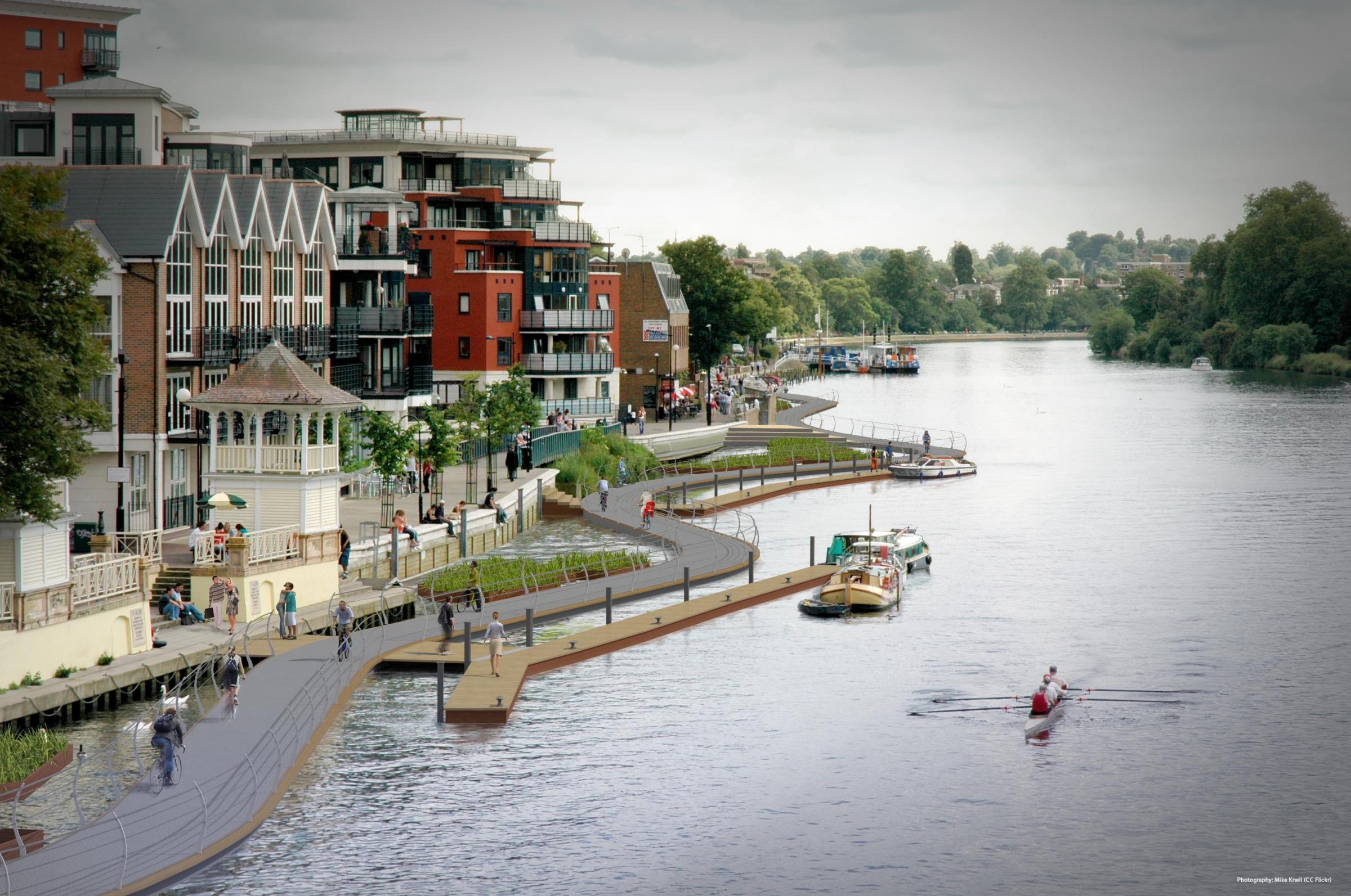 泰晤士河甲板将在位于河边的边缘时从巴特西到金丝雀码头延伸7.45英里,并保持距离海洋交通的安全距离。自行车路径将能够与泰晤士河的潮汐一起轻轻地跌落和升起,并提供访问坡道,以将路线在路线沿线的关键点重新加入。