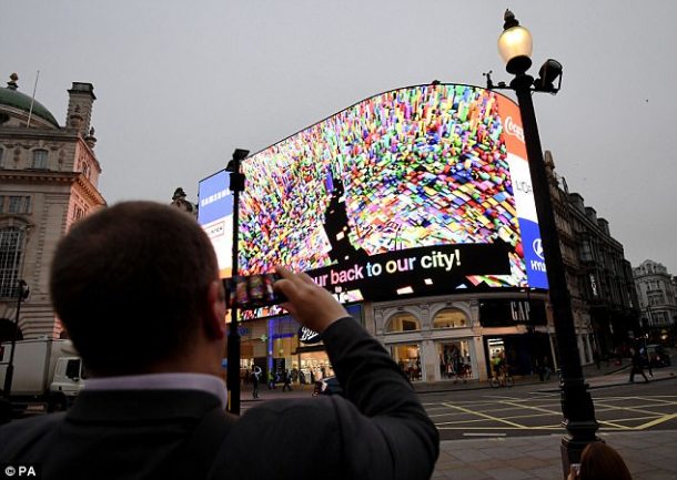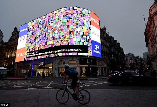九个月后的第一次,伦敦的皮卡迪利马戏团的标志性广告牌通过了大量升级的高科技改头换面。