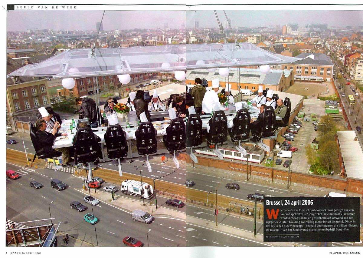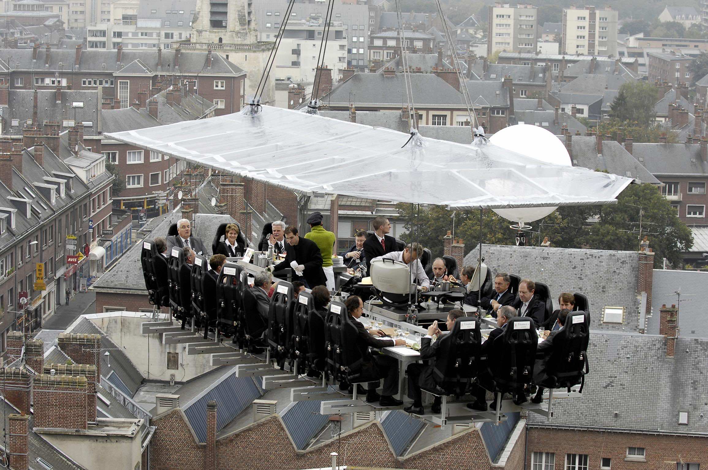 “空中晚餐”还有许多其他功能,包括电视屏幕、灯光、暖气、音响系统和一个自定义横幅(派对可以很有趣)。整个装置都配有位于地面的洗手间,从空中到地面只需一分钟。