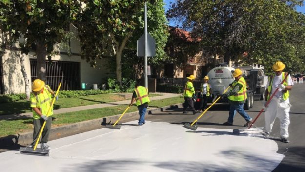 洛杉矶街道服务局正在该市的许多道路上涂上一层白色涂料。街道服务部门表示,这可能会使夏季下午的气温下降10度。洛杉矶15个选区的许多街道都已经涂上了涂料,同样的想法可能很快会在加州其他地区实施。