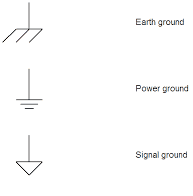 代表连接到通用零参考电压的网的“地面”符号(电源地面)始终是三个水平线的堆,长度向下降低。现在,还有一个代表向下指向向下的开放三角形的符号(信号接地)以及一个看起来像叶片清扫剂的符号,是一条带有三个对角线线的水平线,相对向下(地面)。地面代表水管等地方与地球的连接,并将闪电的传导安全地传导到地面。